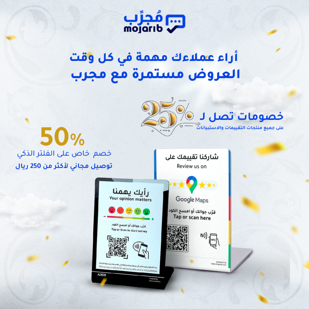 اكتشف ستاندات وستكرات تقييم رضا العملاء، المجهزة بتقنية NFC وQR Code. صممناها خصيصيا لتسهيل عملية جمع آراء وتعليقات و قياس رضا العميل بشكل دائم، مثالية لتحسين تجربة العميل.